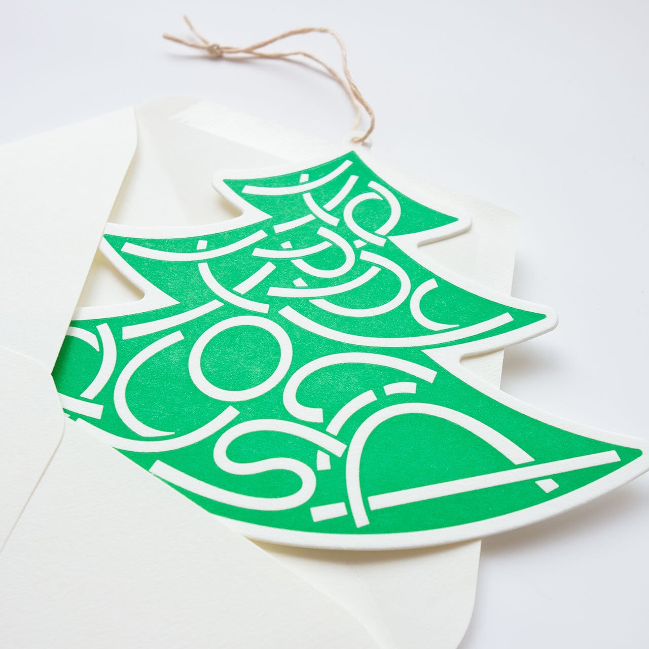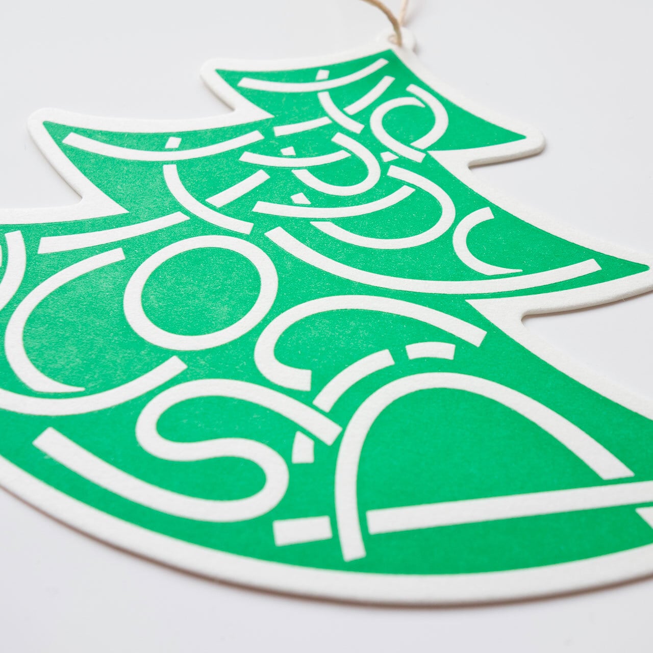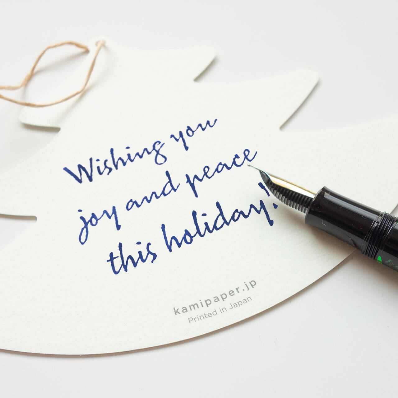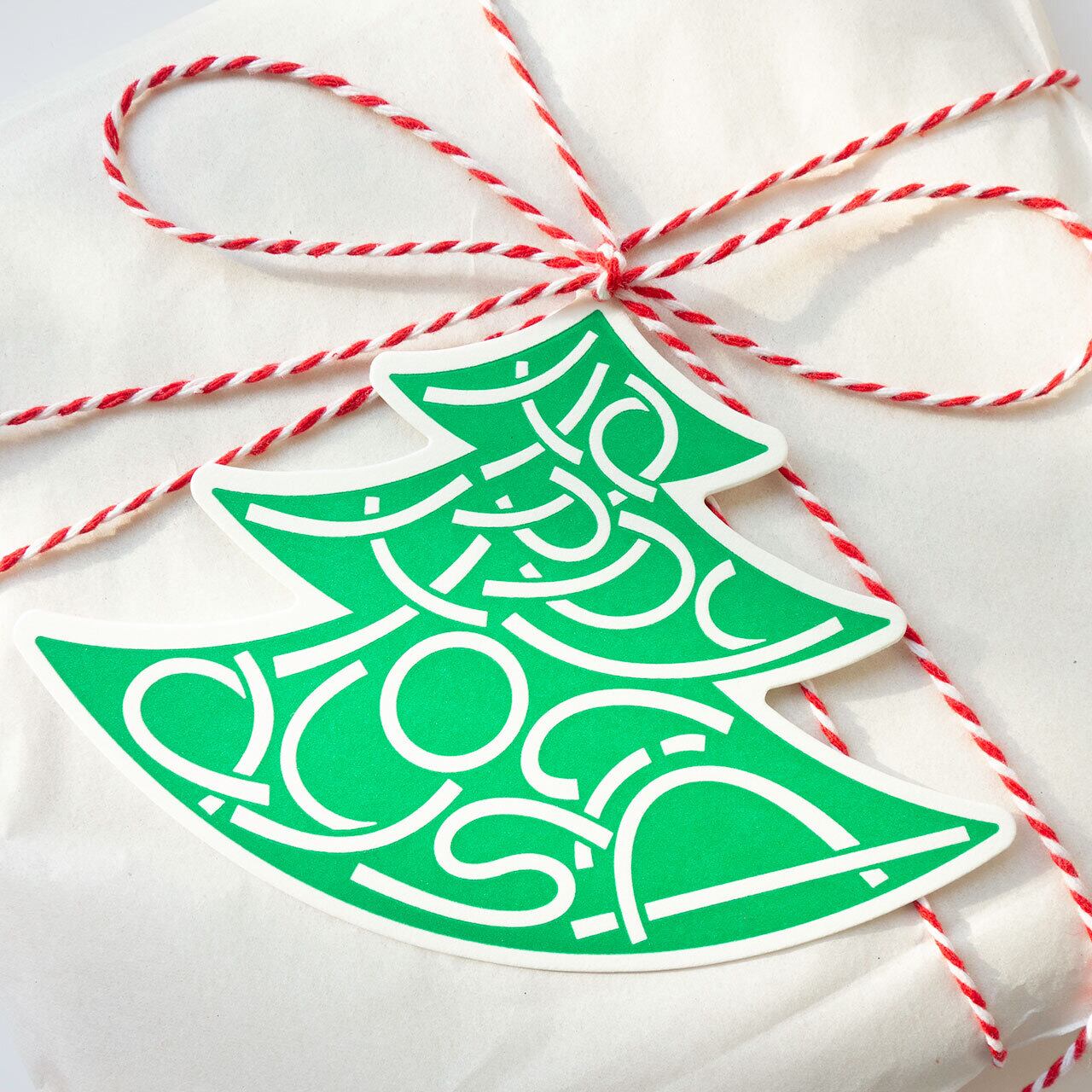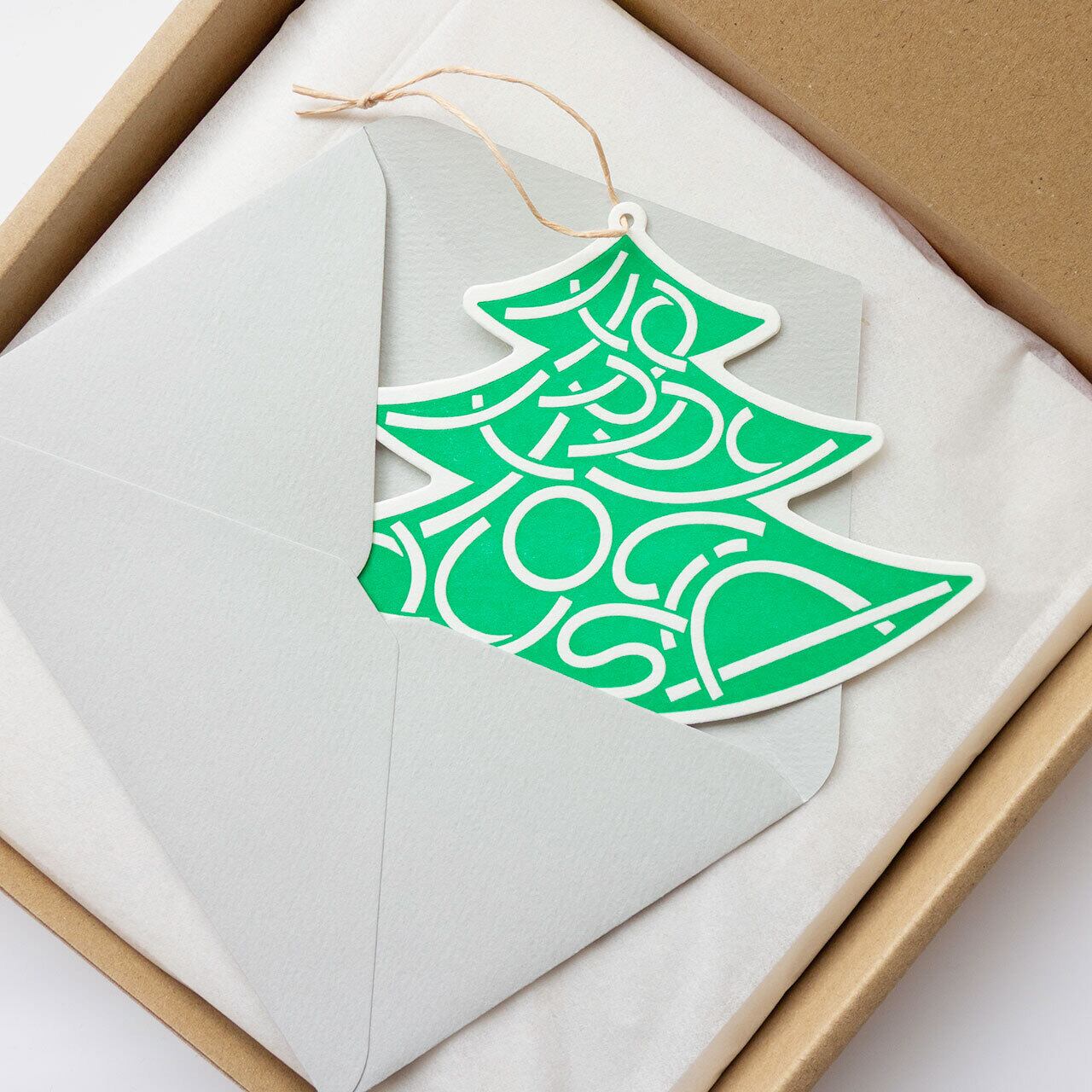 ツリーがモチーフのポップなクリスマスカード。しっかりと厚みのある紙に、鮮やかなグリーンのツリーが活版で印刷されています。ツリーの飾りにも見える「Happy Holidays」と書かれた文字の部分は、活版印刷ならではの凹凸が楽しめます。また、カード上部の穴(直径約2mm)にリボンやコードを通して使うこともできます。通常のクリスマスカードとしてはもちろん、プレゼントに添えるメッセージカードやラッピング用のタグ、ツリー用の飾りなどさまざまな使い方が楽しめるユニークなクリスマスカードです。